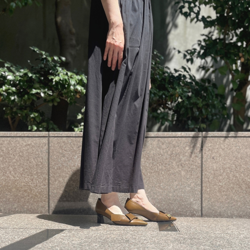 ほどよい5cmヒールの高さでスタイルアップしながらも、しっかりと安定感のある履き心地で、立ち姿がすっきり決まります。甲にデザインがあるポインテッドトゥなので、服装はワンピースでも流行りのワイドボトムでもあわせやすく、オン・オフどちらでも活躍しそうです。