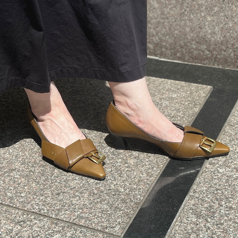 甲まわりには、まるでベルトをきゅっと巻いたようなアクセントが。立体感のあるデザインで、ただのパンプスじゃない“おしゃれ一歩先”を感じさせてくれます。素材は上品な本革だから、質感もしっかりしています。
