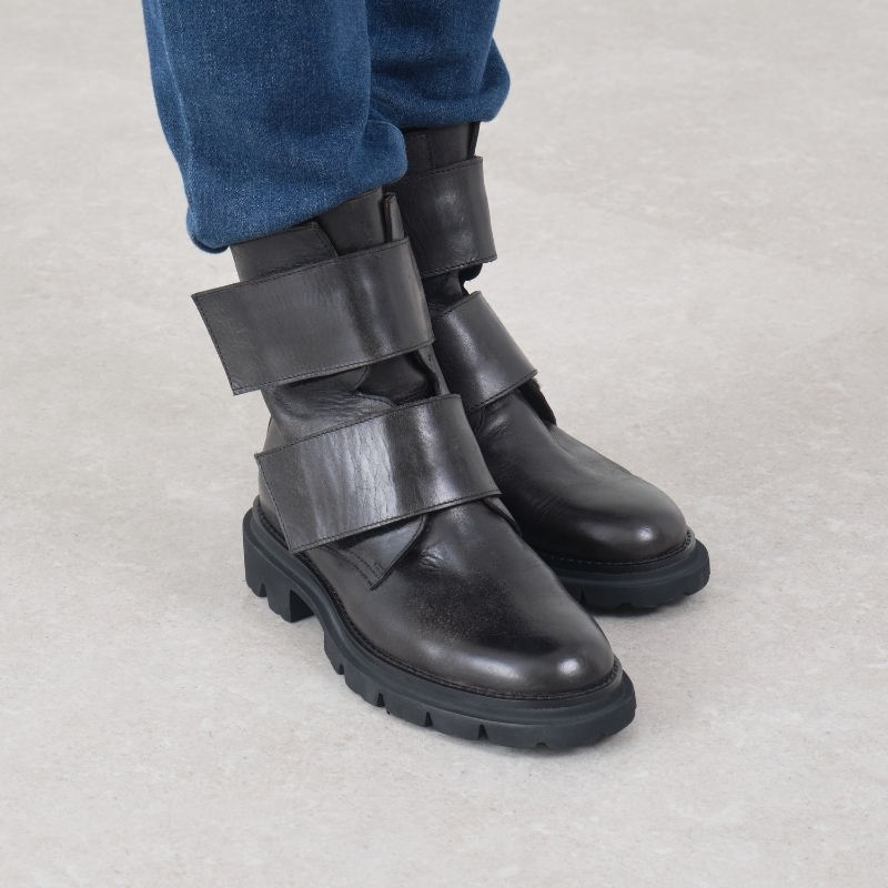 アイキャッチなダブルベルトは面ファスナー仕様。甲に近いベルトはしっかりと、履き口側はややルーズに調整して、シルエットの変化を楽しむスタイルも◎。