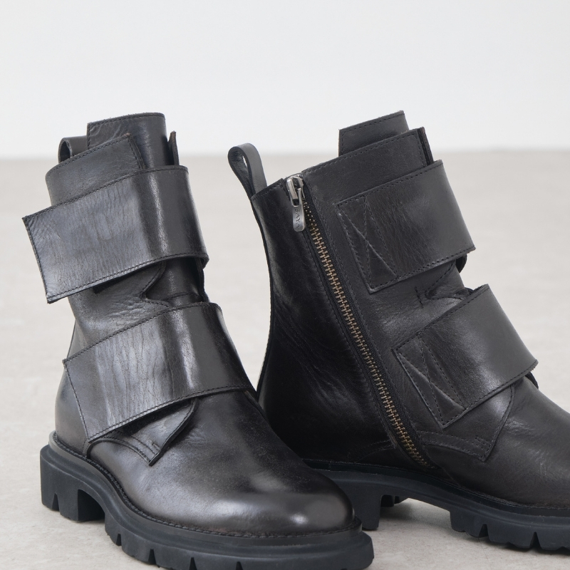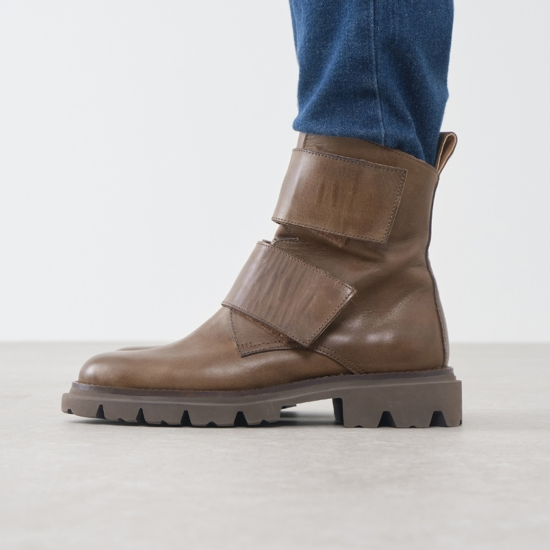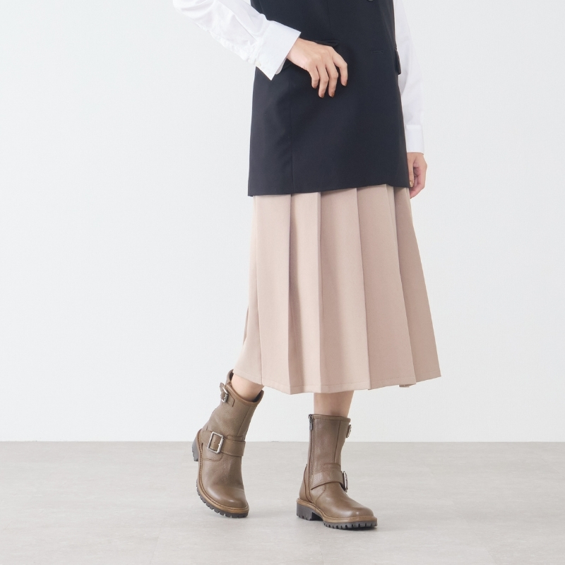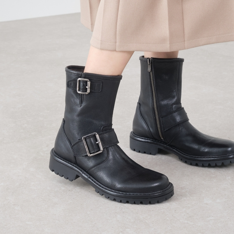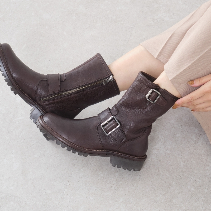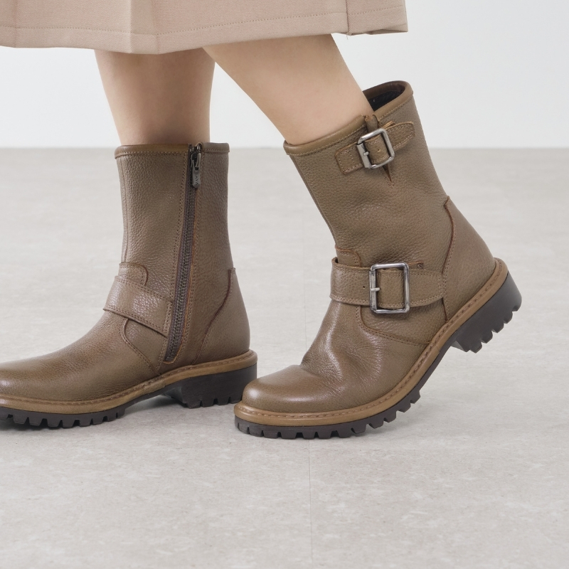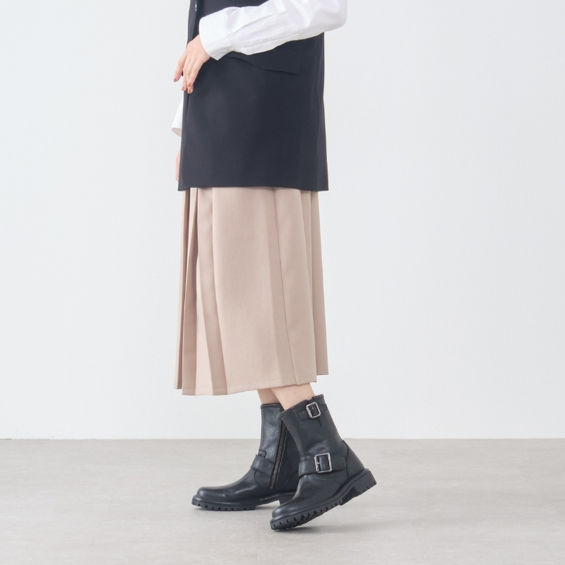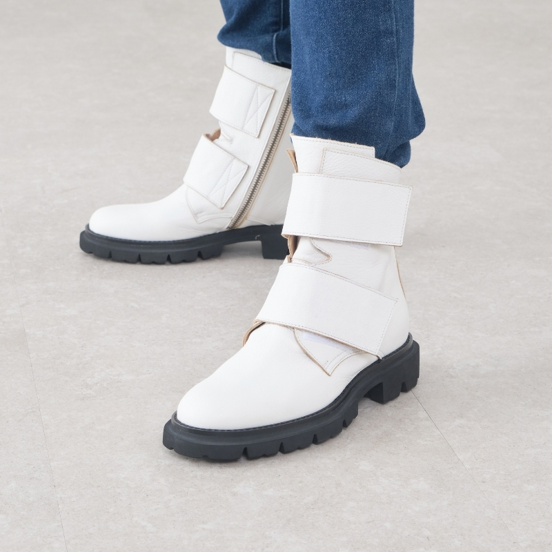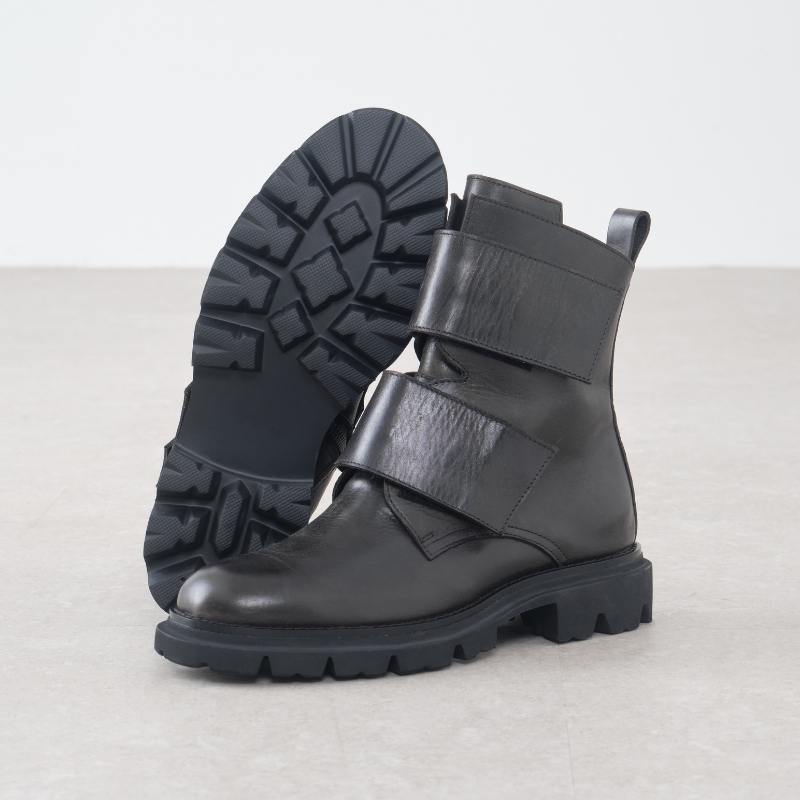 スッキリとしたラウンドトゥに程よく存在感を添えるボリュームソール。太めのダブルベルトがアクセントになったバランスの良いワークブーツです。ブラック、ブラウン、アイボリーの3色展開。色の違いで印象が変わり、お好みのスタイルに合わせて楽しめる一足です。