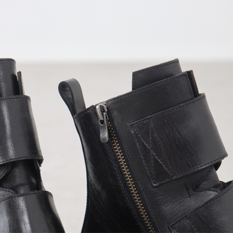 斜めに配した内ファスナーで、脱ぎ履きのしやすい仕様に。面ファスナーの調節と合わせれば、パンツインもかっこよくまとまります。オリジナルロゴ入りなのもさりげないポイント。