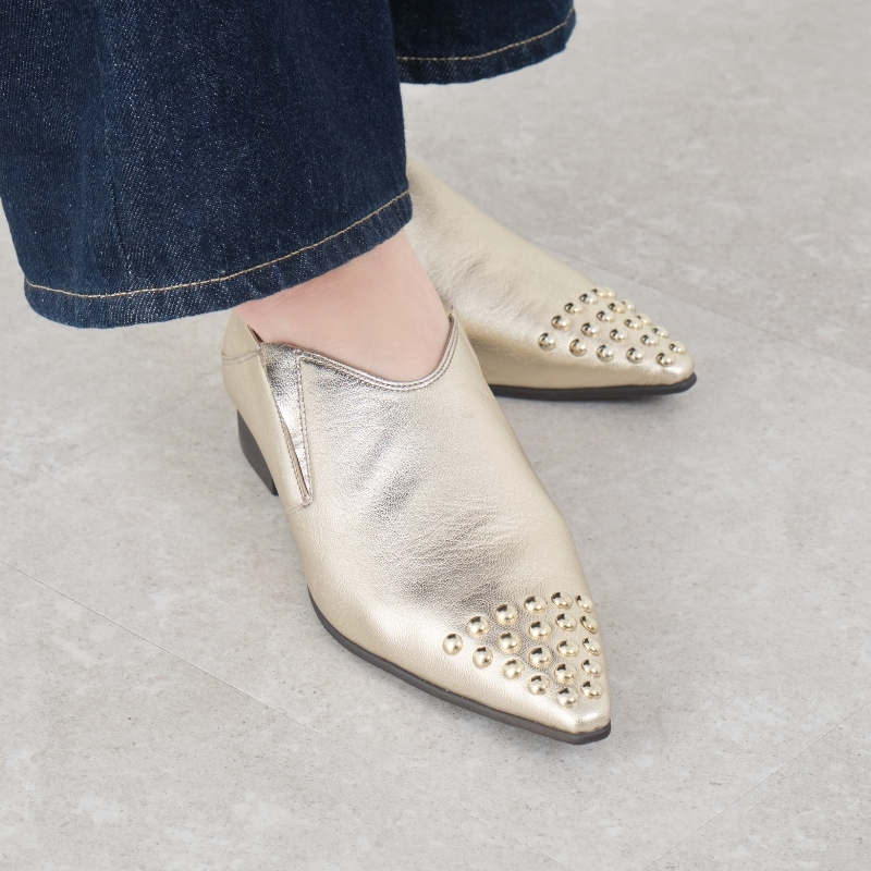 ライトゴールドのスタッズがさりげなく効いた、大人のためのマニッシュシューズ。ブラック・カーキ・プラチナの3色は、どれも冬のコーデにすっと馴染みながら、足元をほどよく引き締めてくれる存在感。オンオフ問わず、年間を通して活躍する一足です。