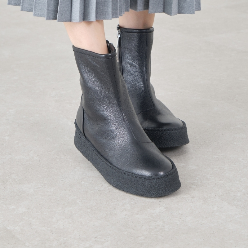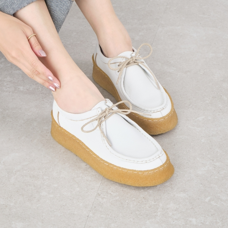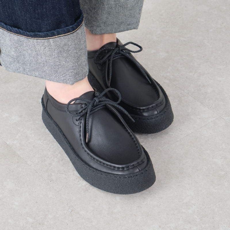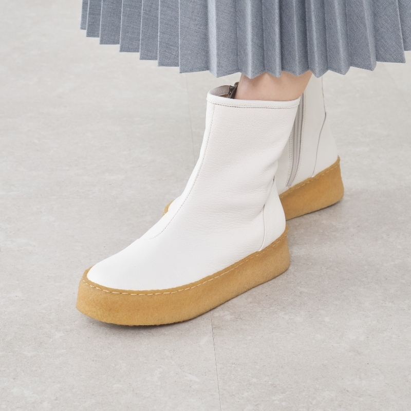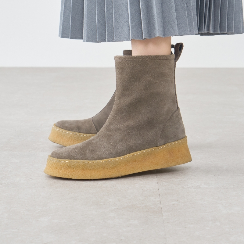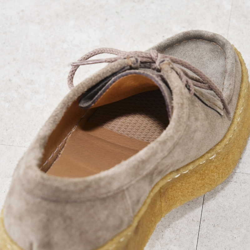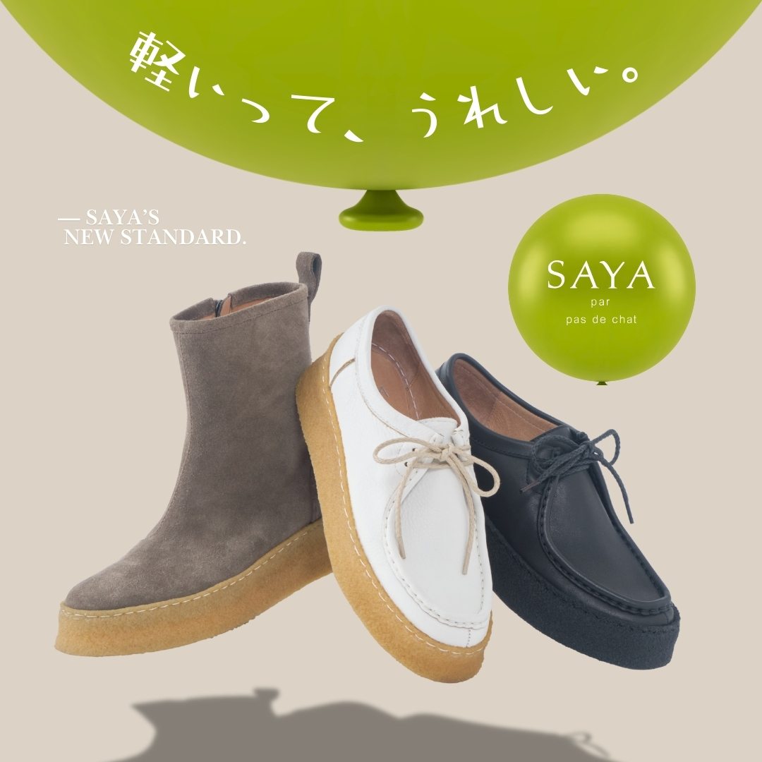 かぶせモカ仕様がつま先にやわらかな丸みを添え、上品でやさしい表情に。厚底クレープソールには繊細なステッチを施し、SAYAらしい丁寧なつくりが感じられます。