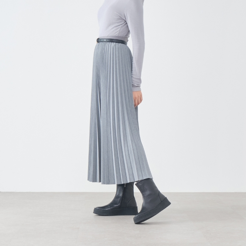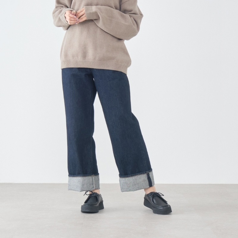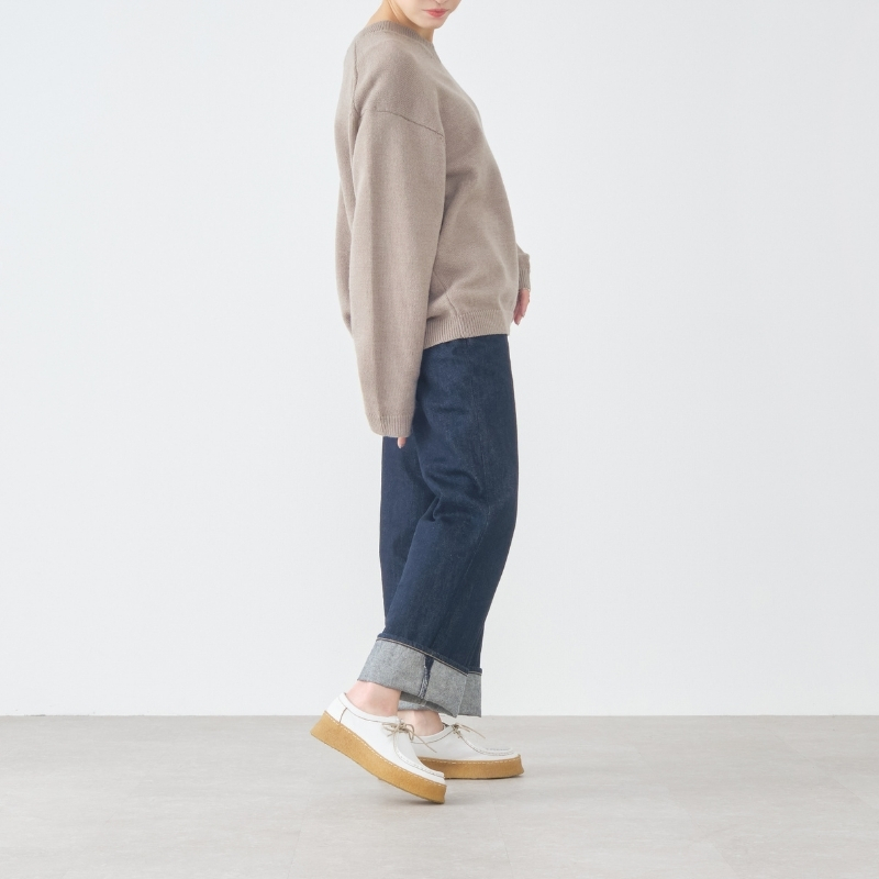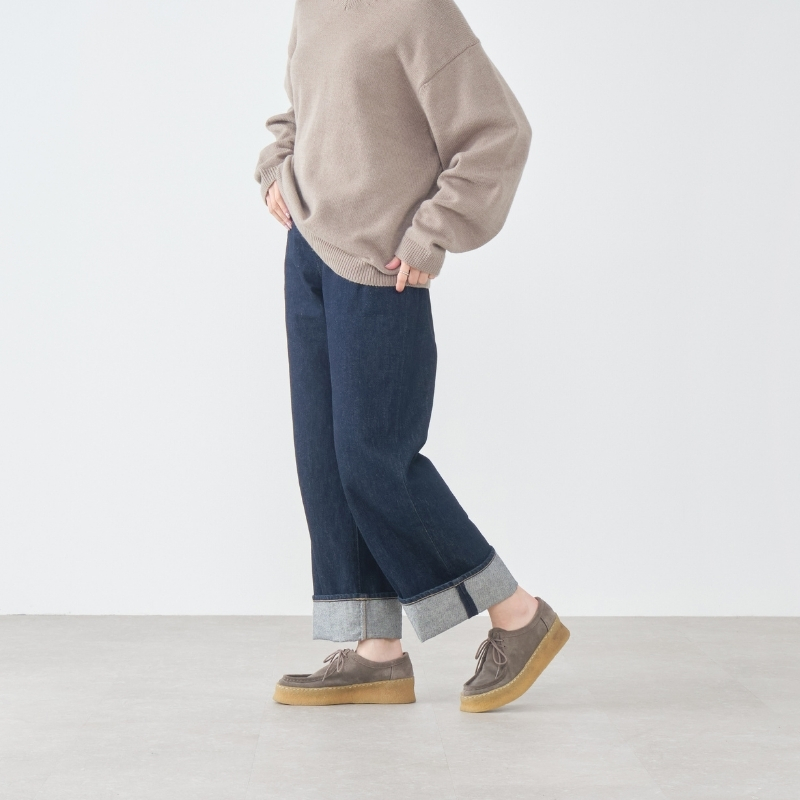デニムとの相性は言うまでもなく抜群。革靴らしい上品さと、厚底クレープがつくるさりげないカジュアル感で、ちょうどいい抜けを添えてくれます。ブラックはソールまで黒で統一され、シックな雰囲気に。グレージュスエードとアイボリーは、本クレープの存在感がやわらかく映え、スタイリングにやさしいニュアンスを生み出します。