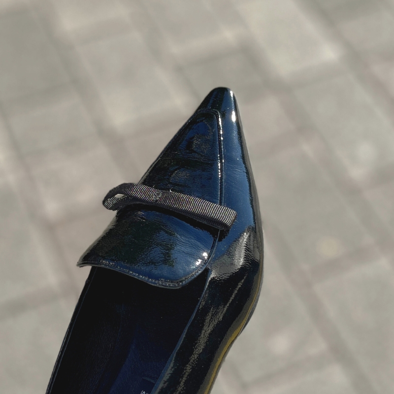 ハンサムなポインテッドトゥとフェミニンなリボンのコントラストが、おしゃれ心をくすぐります。