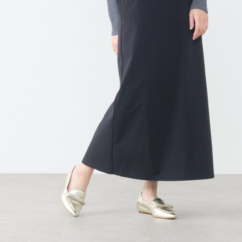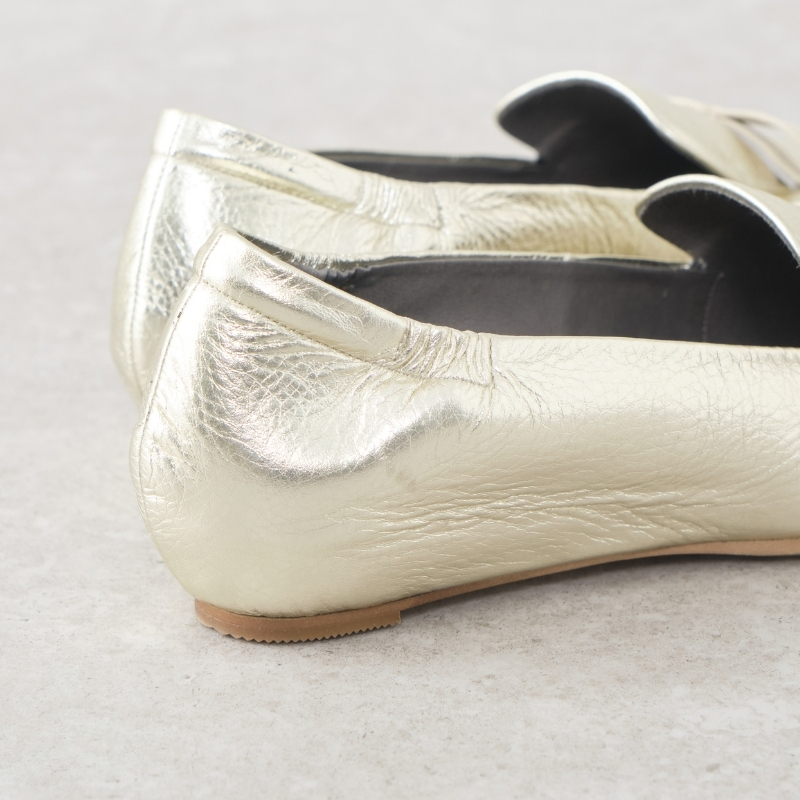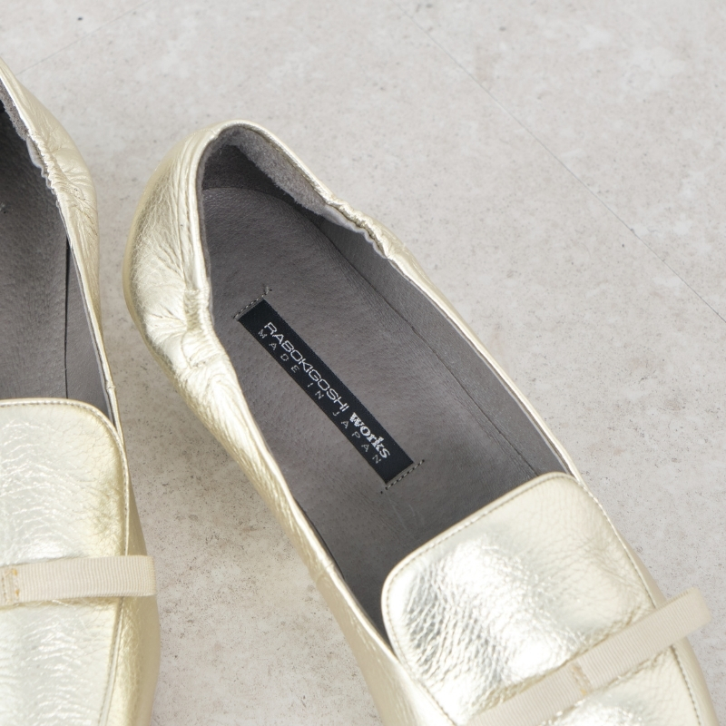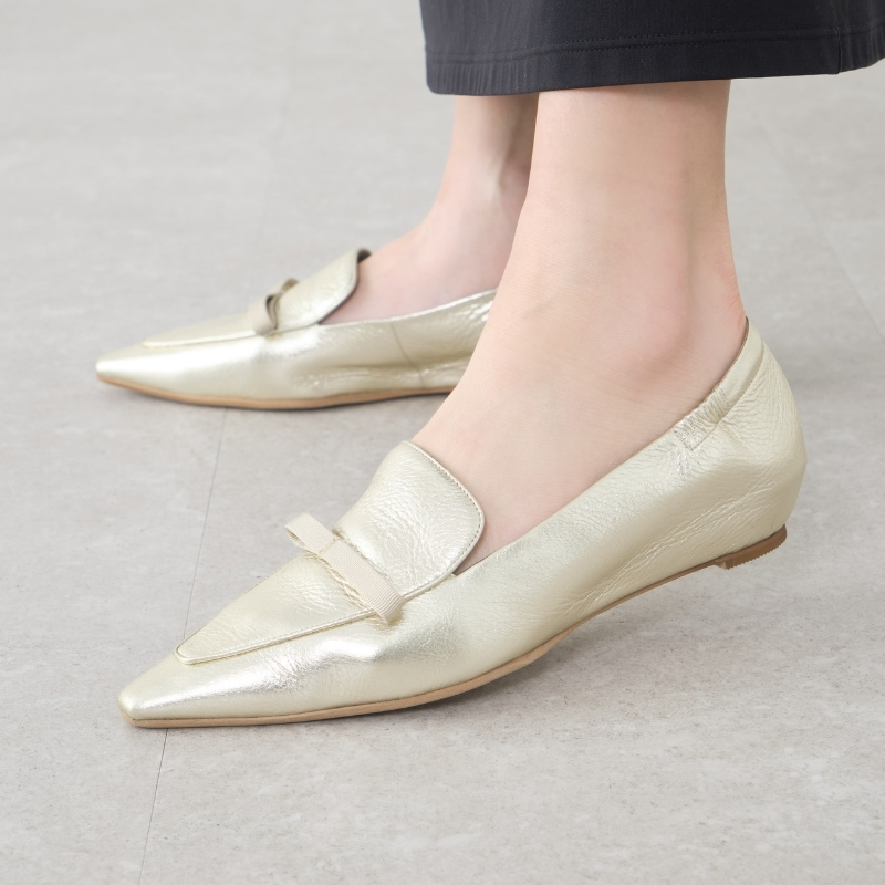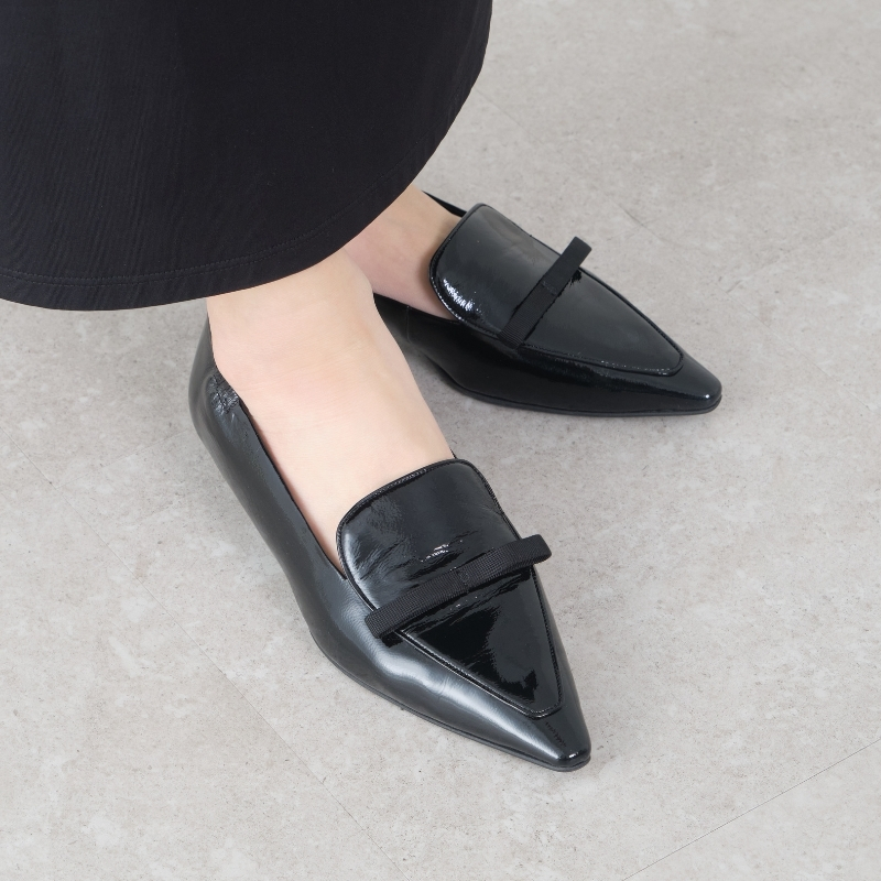 艶のあるブラックエナメルと、箔を載せたメタリックカラー。リボンとのコントラストが美しく、足元にさりげないアクセントを添えます。