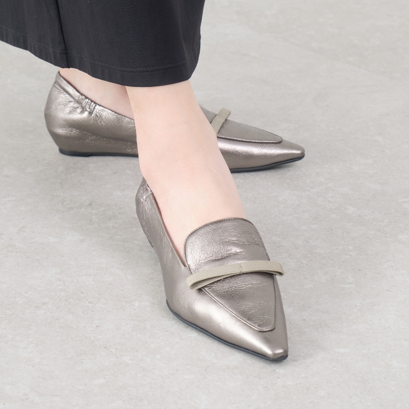 モカデザインにグログランリボンを添えた、ローファー風ポインテッドトゥパンプス。深めの甲が安心感のある履き心地を叶えながら、シャープなフォルムがハンサムな印象に。ブラックエナメル、ダークシルバー、プラチナのクールなカラーが、大人のスタイルを引き締めます。