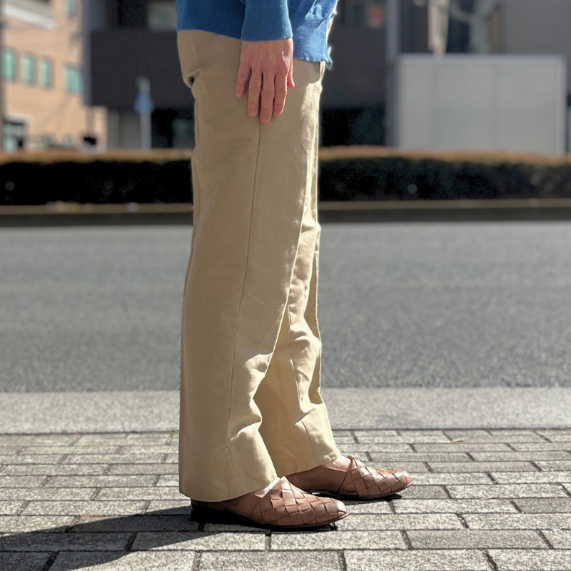 今回は、ブルーのニットにベージュのチノパンを合わせたカジュアルなコーディネートに。リラックス感のある着こなしに、足元のレザーの質感が加わることで、スタイルをさりげなく格上げしてくれます。